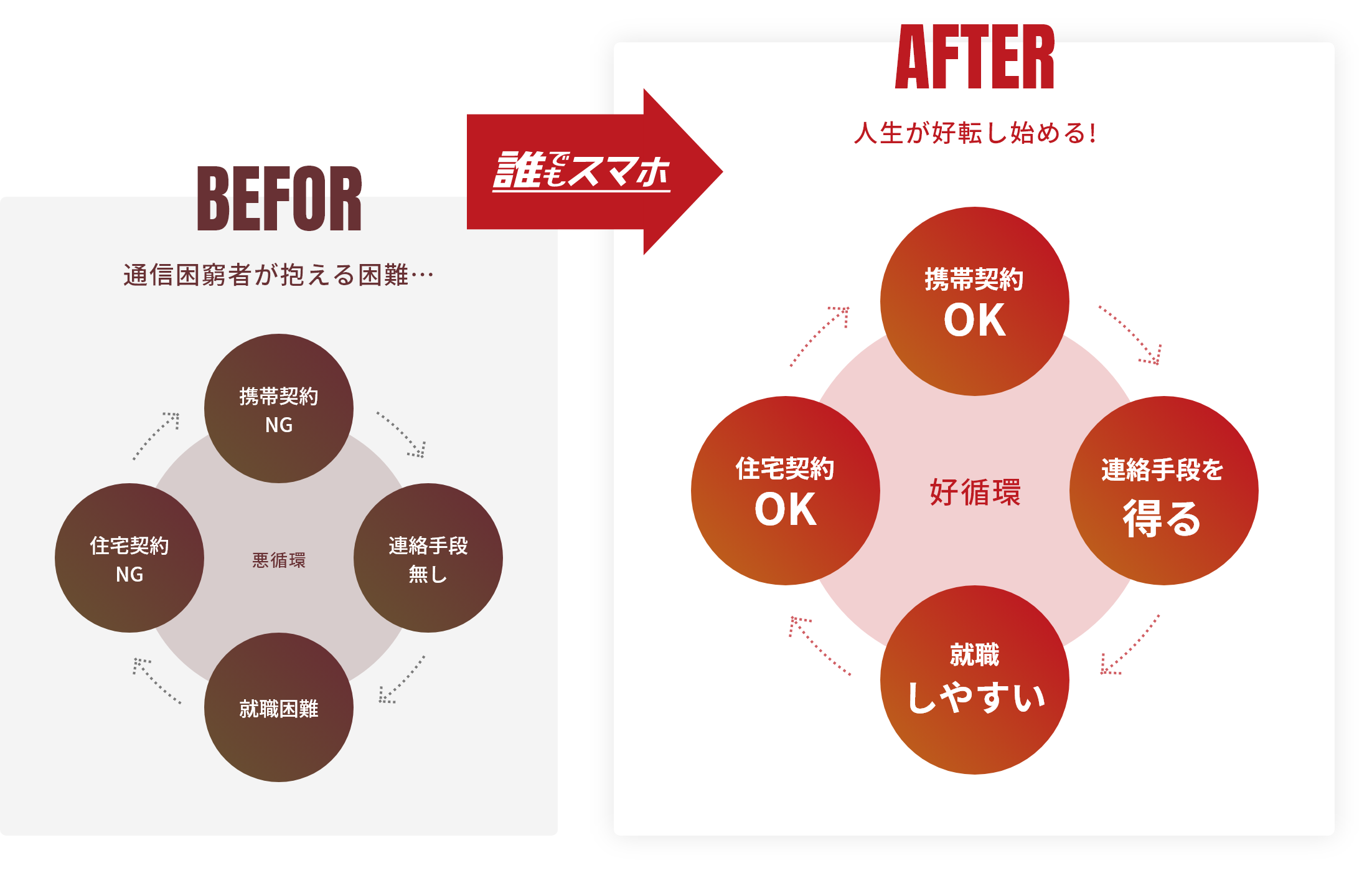 すべての人に届ける。 - 「誰でもスマホ」は、過去の支払い問題やクレジットカード未所持で、携帯が契約できない方々に向けて、誰もが携帯を持てる希望を提供します。就職や家の契約など、通信サービスを超えた生活の基本を取り戻す手助けをすることで、人生を前向きに変える一歩をサポートします。